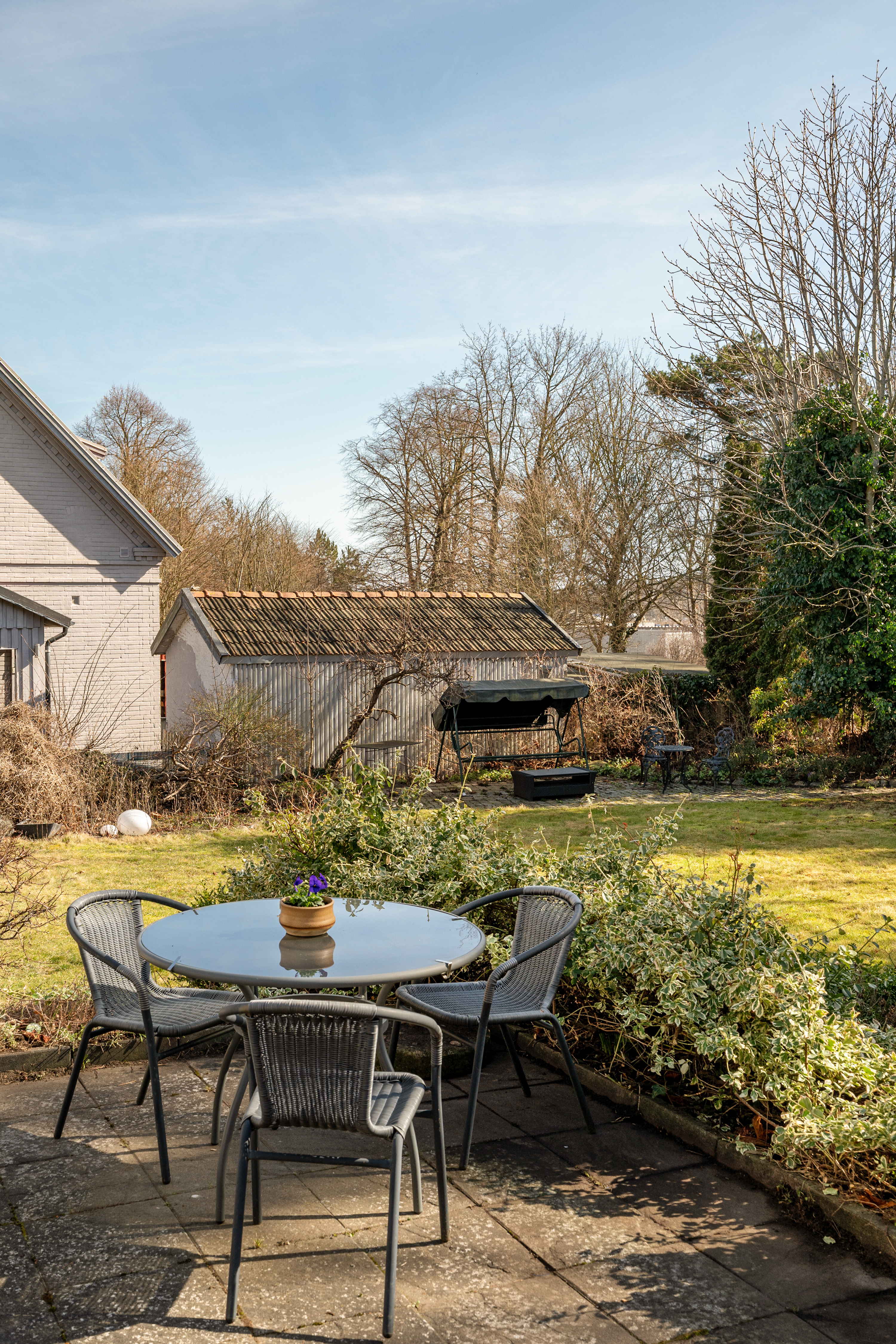 I anslutning till längan är det carport på baksidan. Det finns också två förrådsbodar på tomten, en till ved och en till redskap.