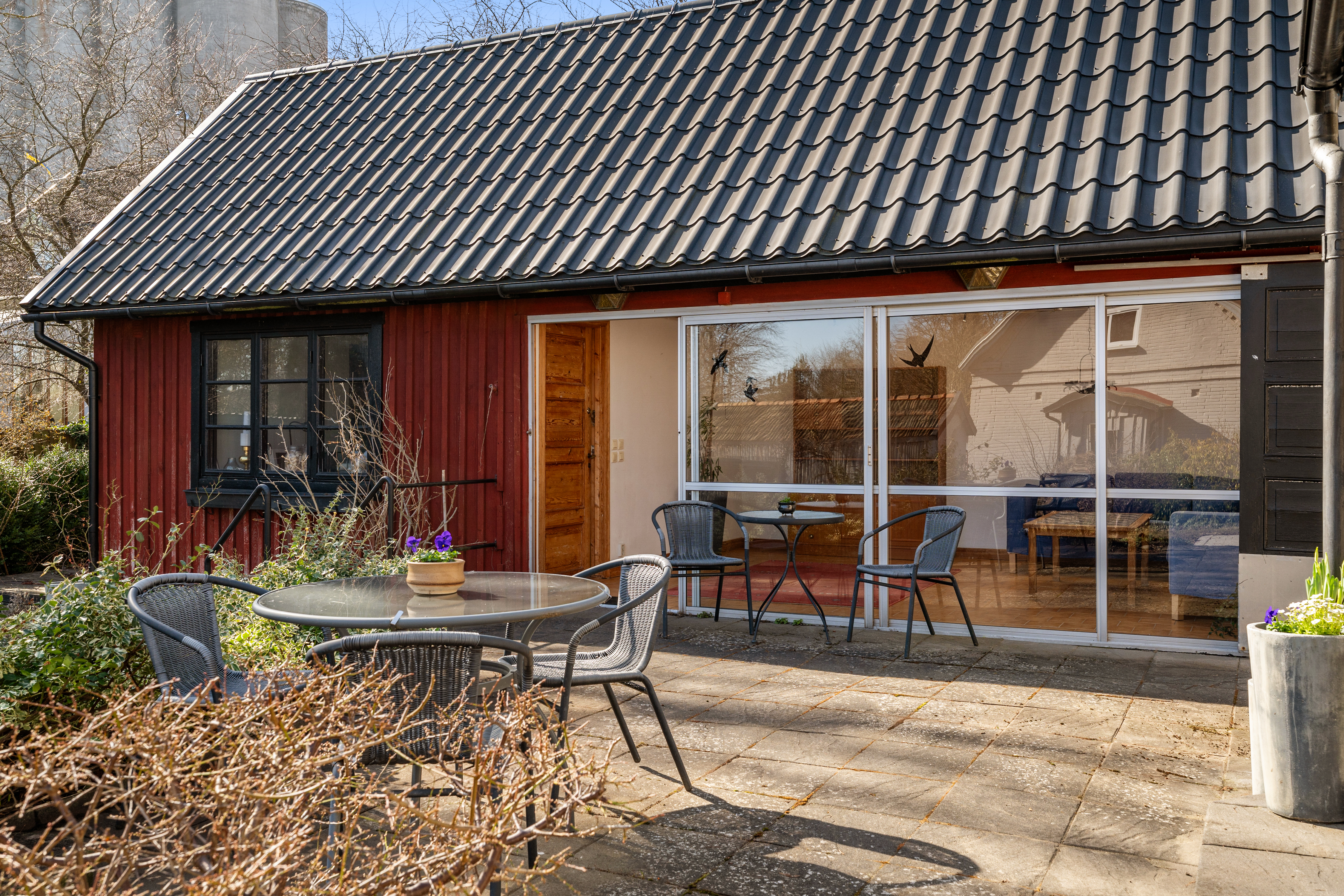 Stenlagd uteplats i husets vinkel. Inglasad altanplats i friliggande länga.