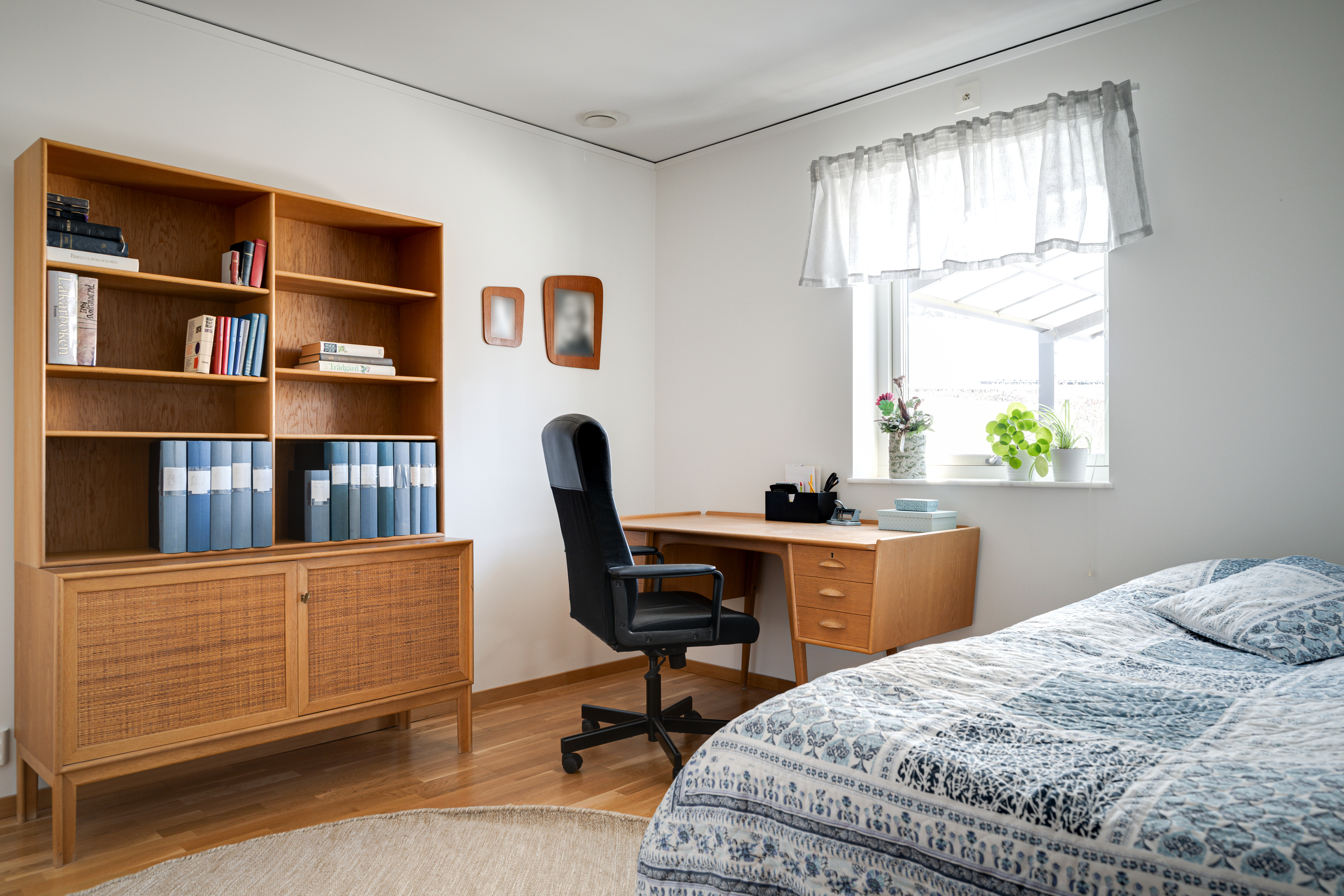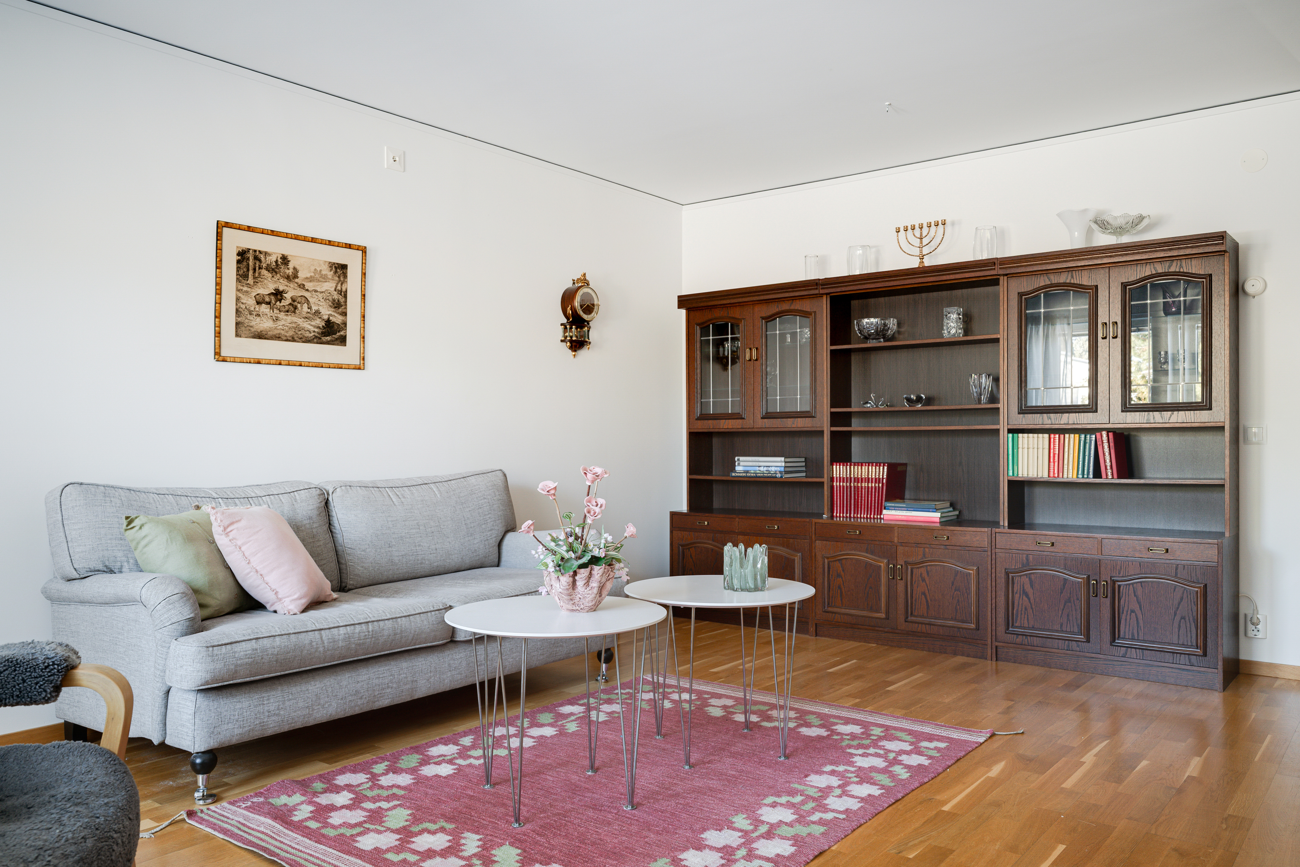- Parkettgolv och målad vägg.