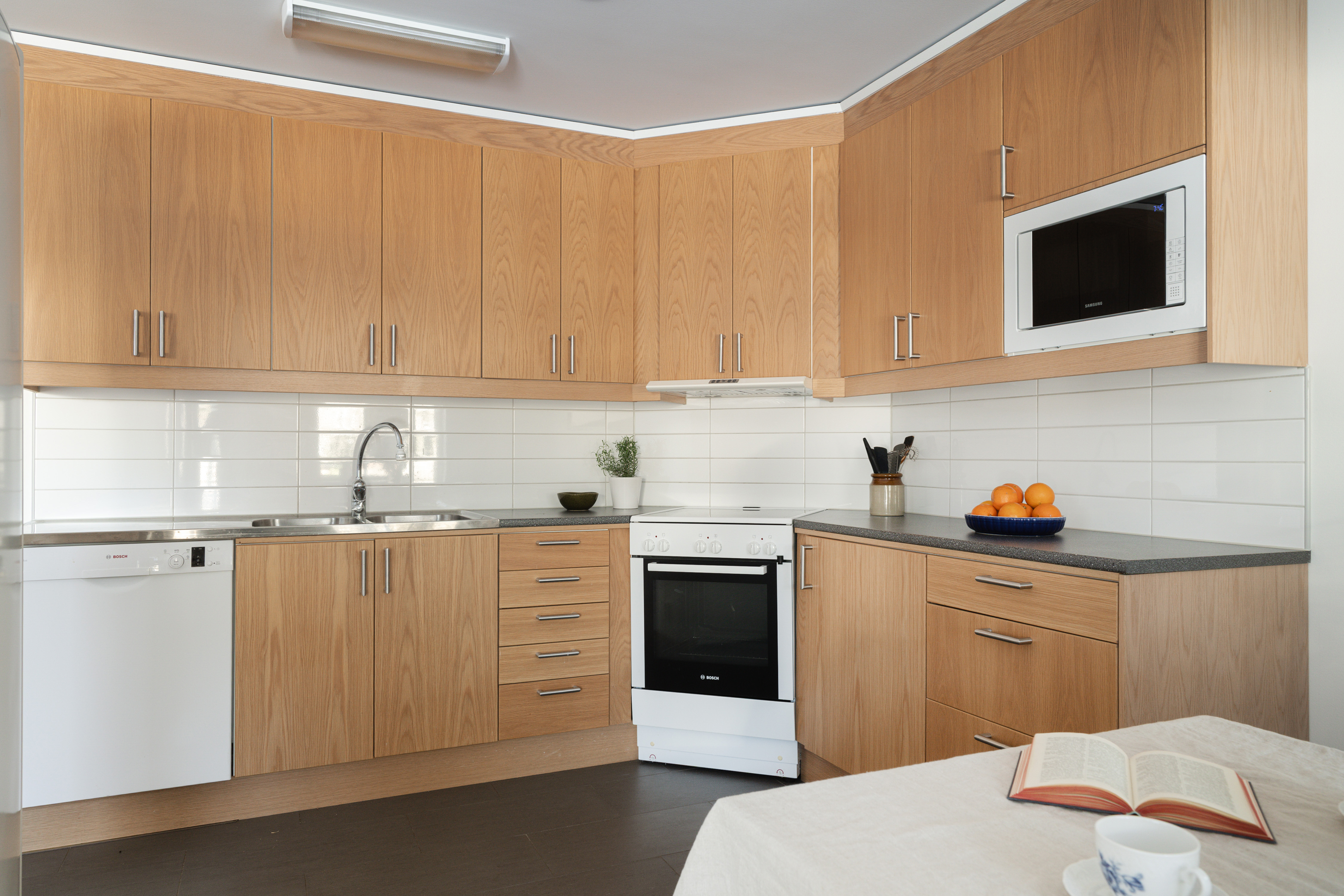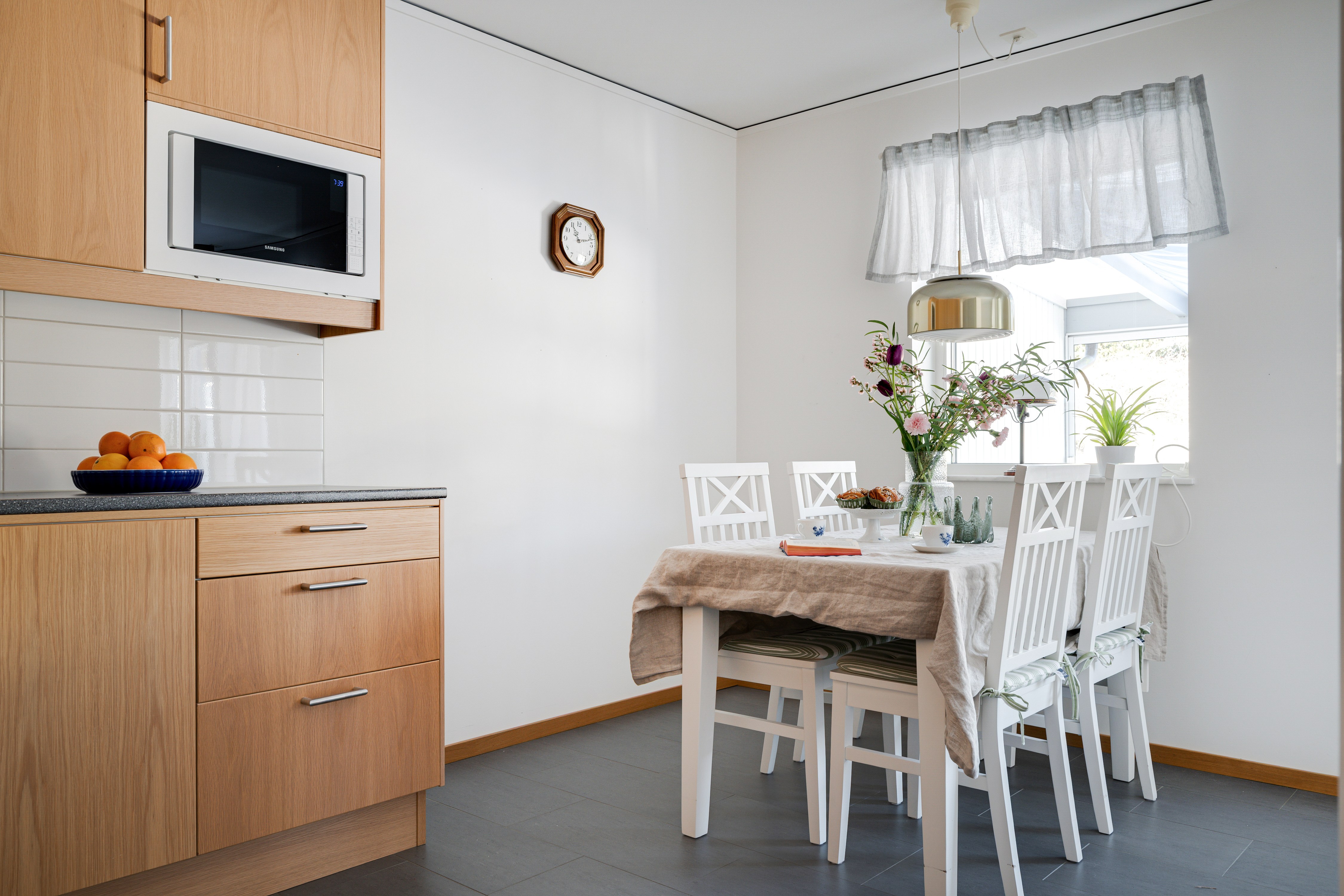 - Klinkergolv och målad vägg. - Köksinredning med luckor i ek, grå laminatbänkskiva och rostfri bänkskiva vid diskho. Vitt kakel ovan bänkyta. - Ugn, köksfläkt, diskmaskin, mikrovågsugn, kyl och frys.