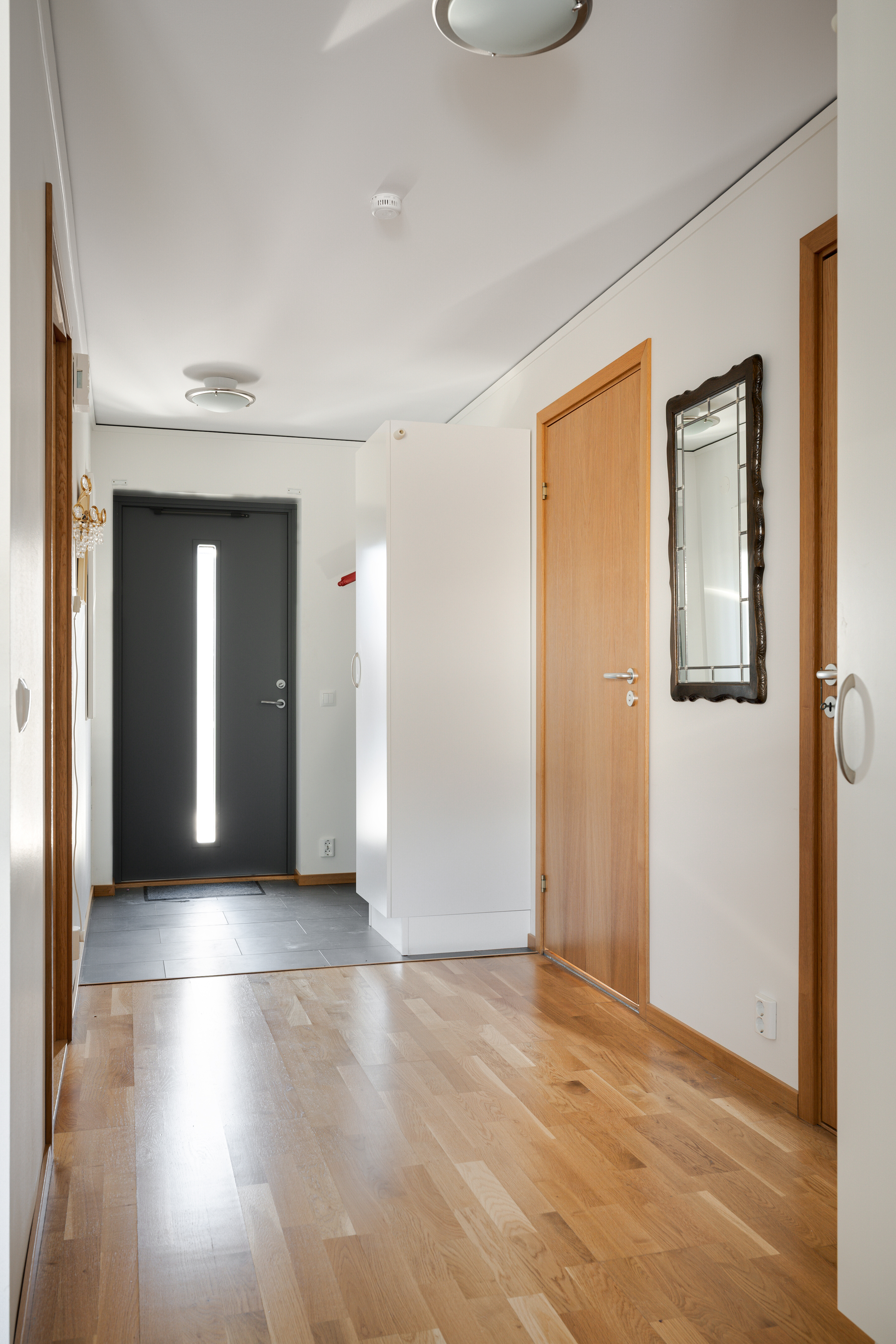 - Klinkergolv och målad vägg. - Parkettgolv i resten av hallen. - Plats för hatthylla/skohylla. - Garderob.