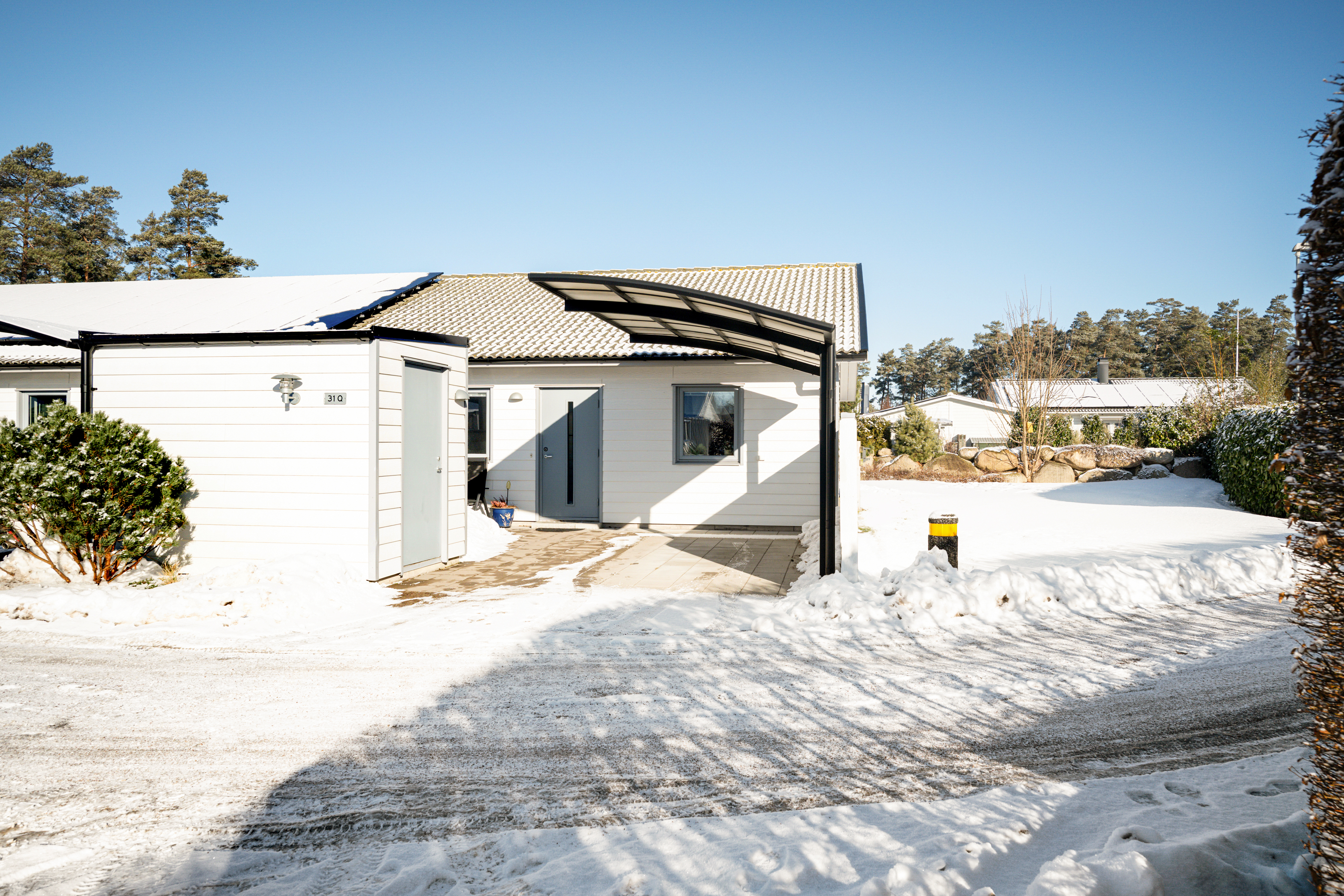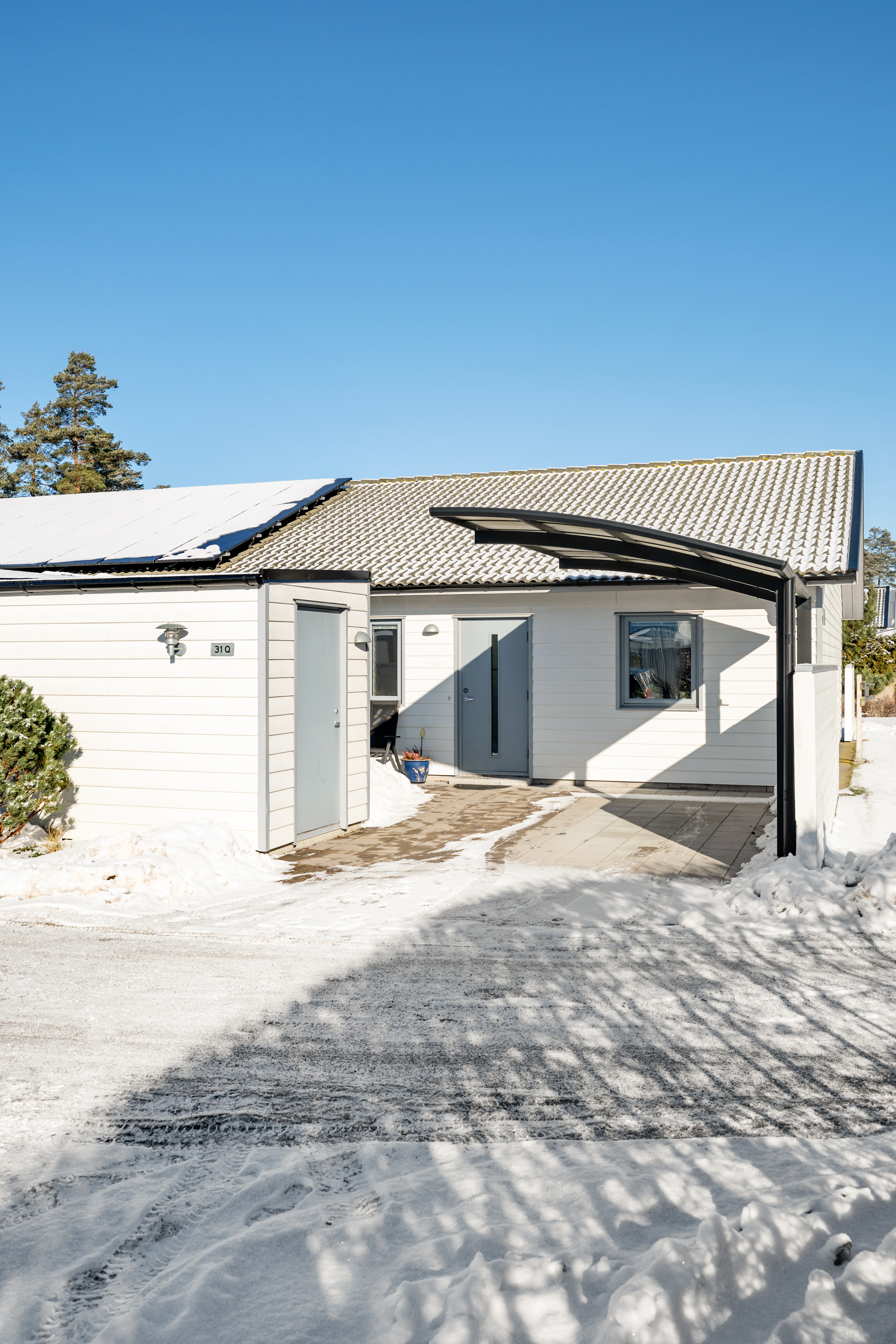 Framsida med uppfart och stenlagd parkeringsplats med skärmtak