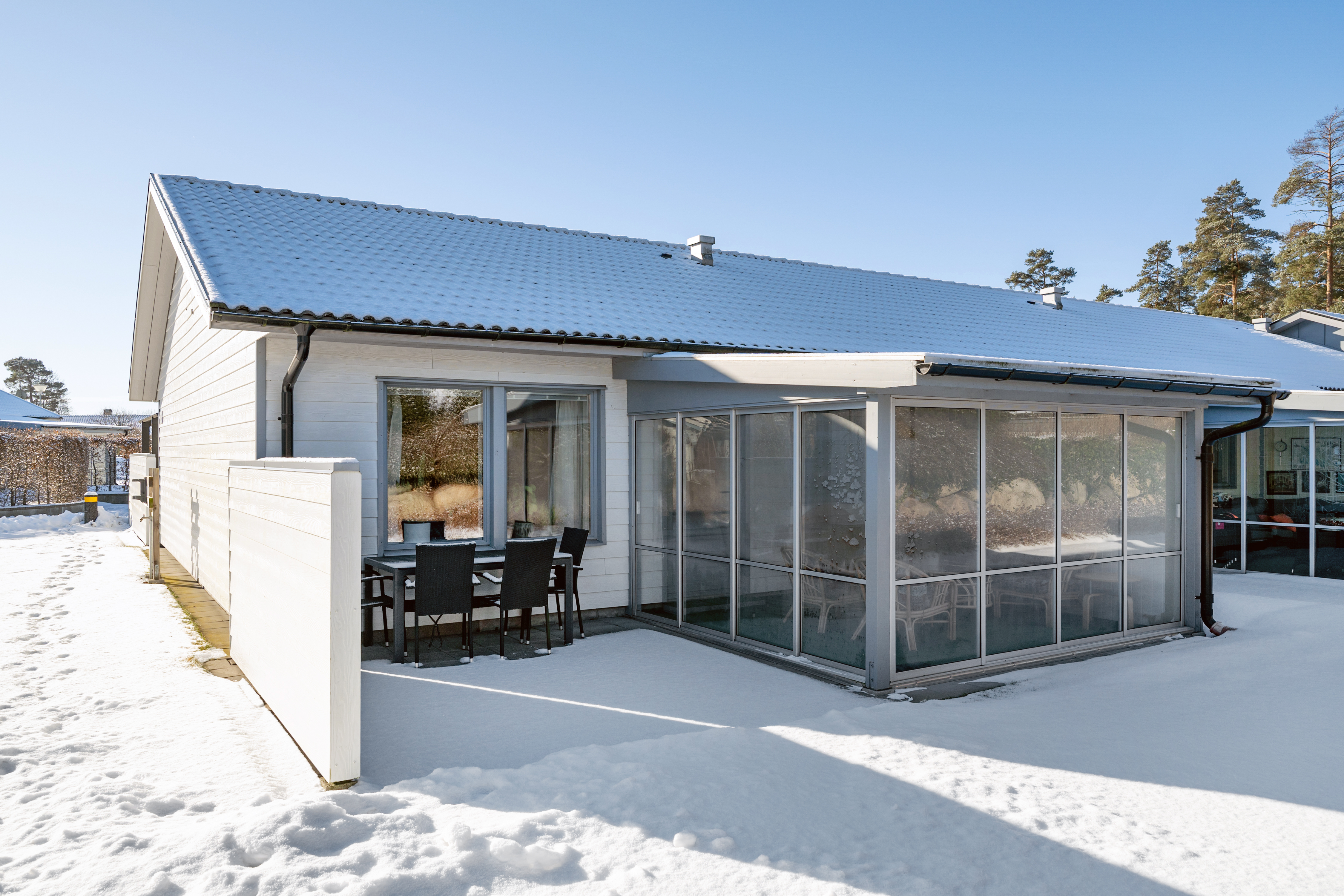 Baksida med uterum och stenlagd uteplats