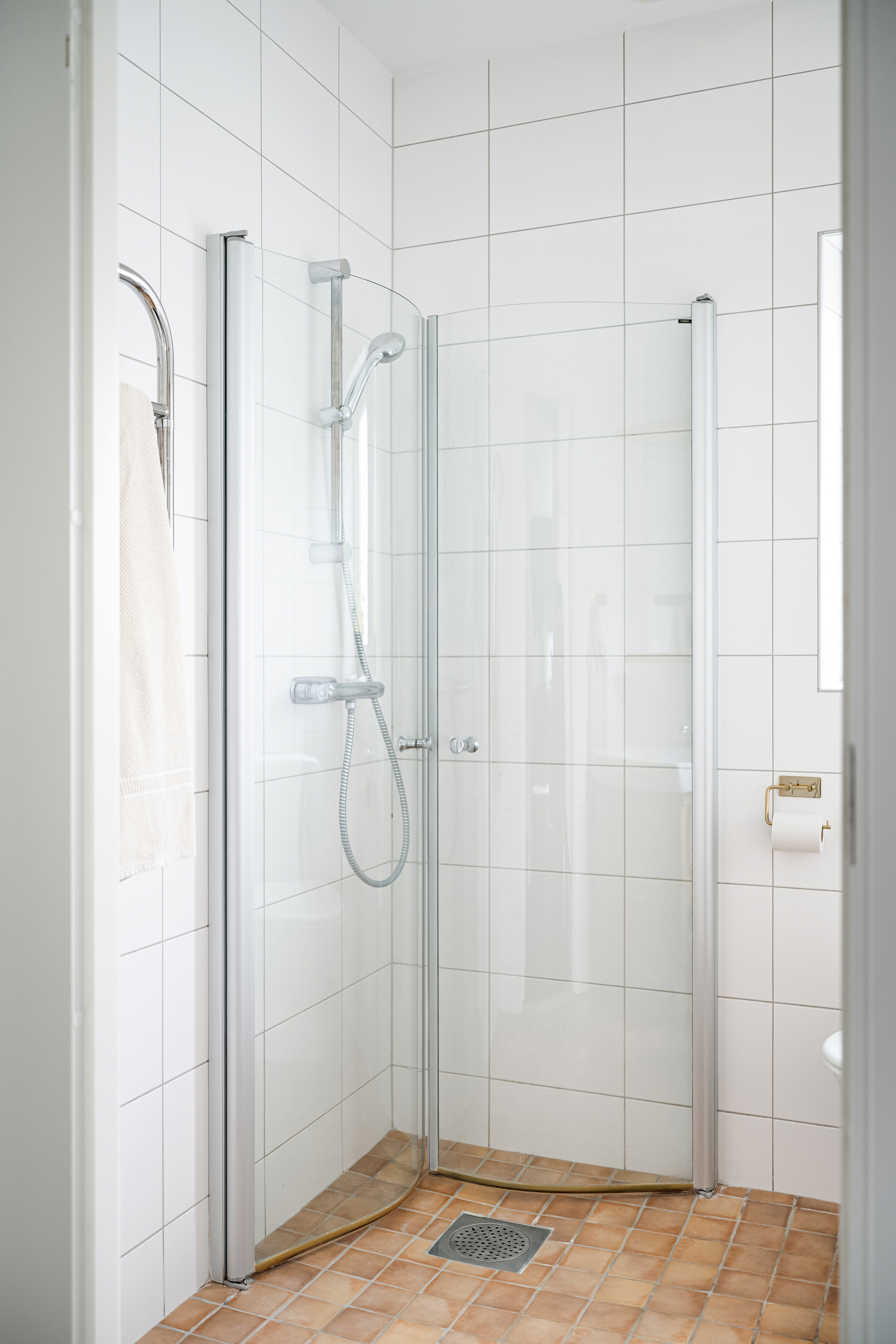 Klinkergolv och kaklade väggar.
