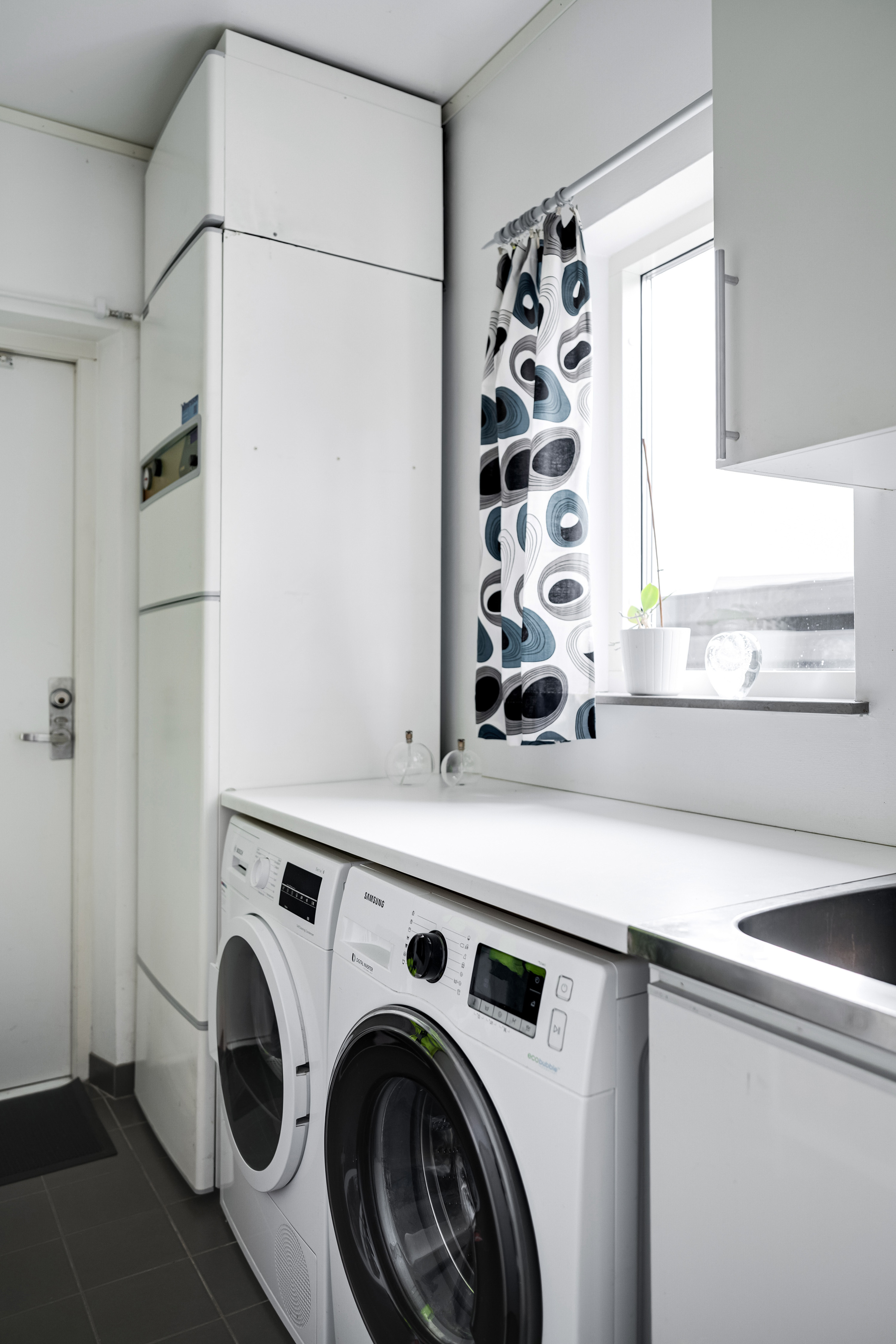 Klinkergolv och målade väggar och kakel ovan bänkyta. Tvättmaskin 2021, torktumlare 2020 samt avhärdningsfilter 2025.