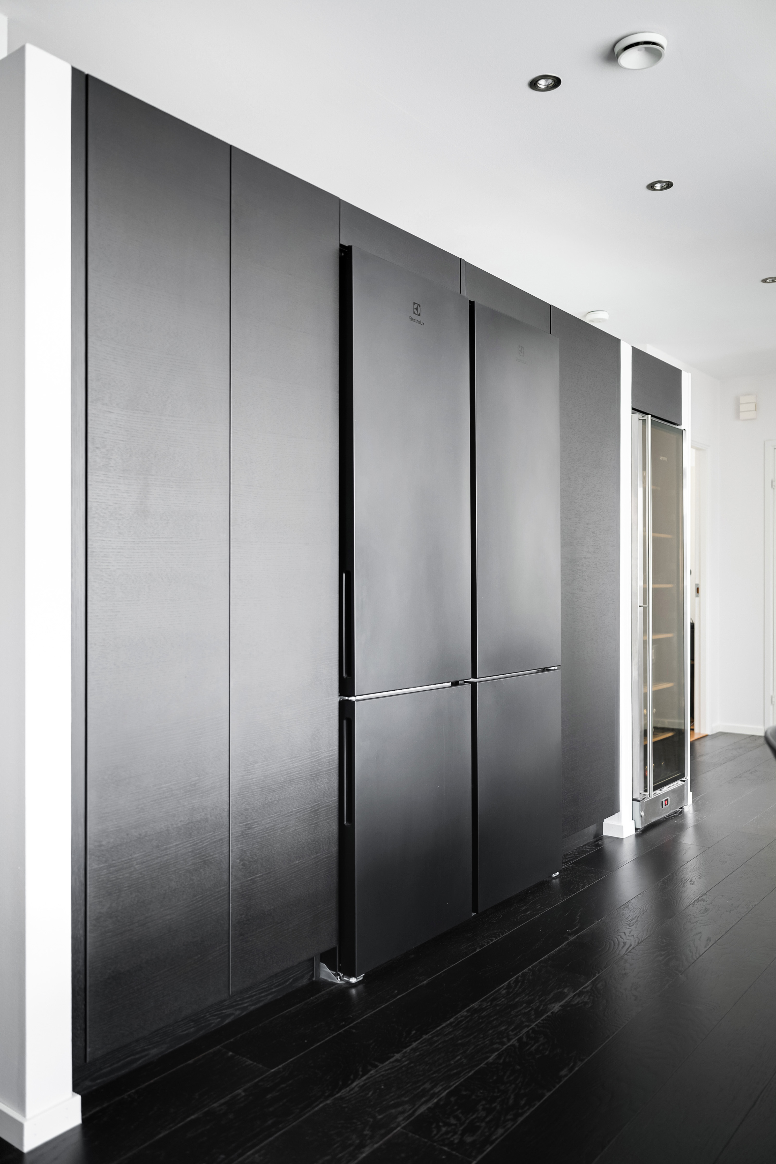Trägolv och ommålade väggar 2025. Nytt Ballingslövskök med nya maskiner, Electrolux från 2025. SMEG vinkyl. Köksön kommer att tas bort då den inte passar med den nya inredningen.