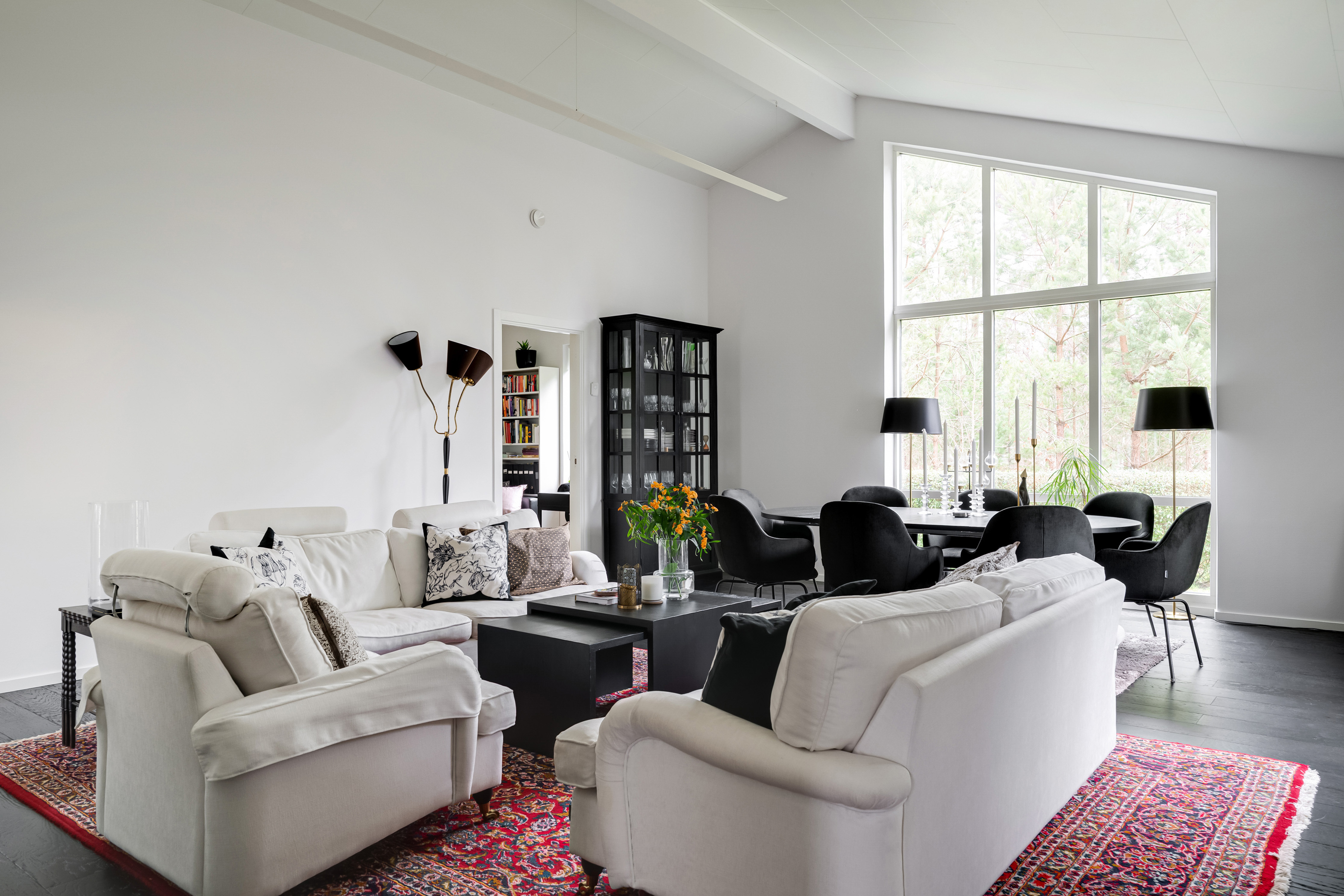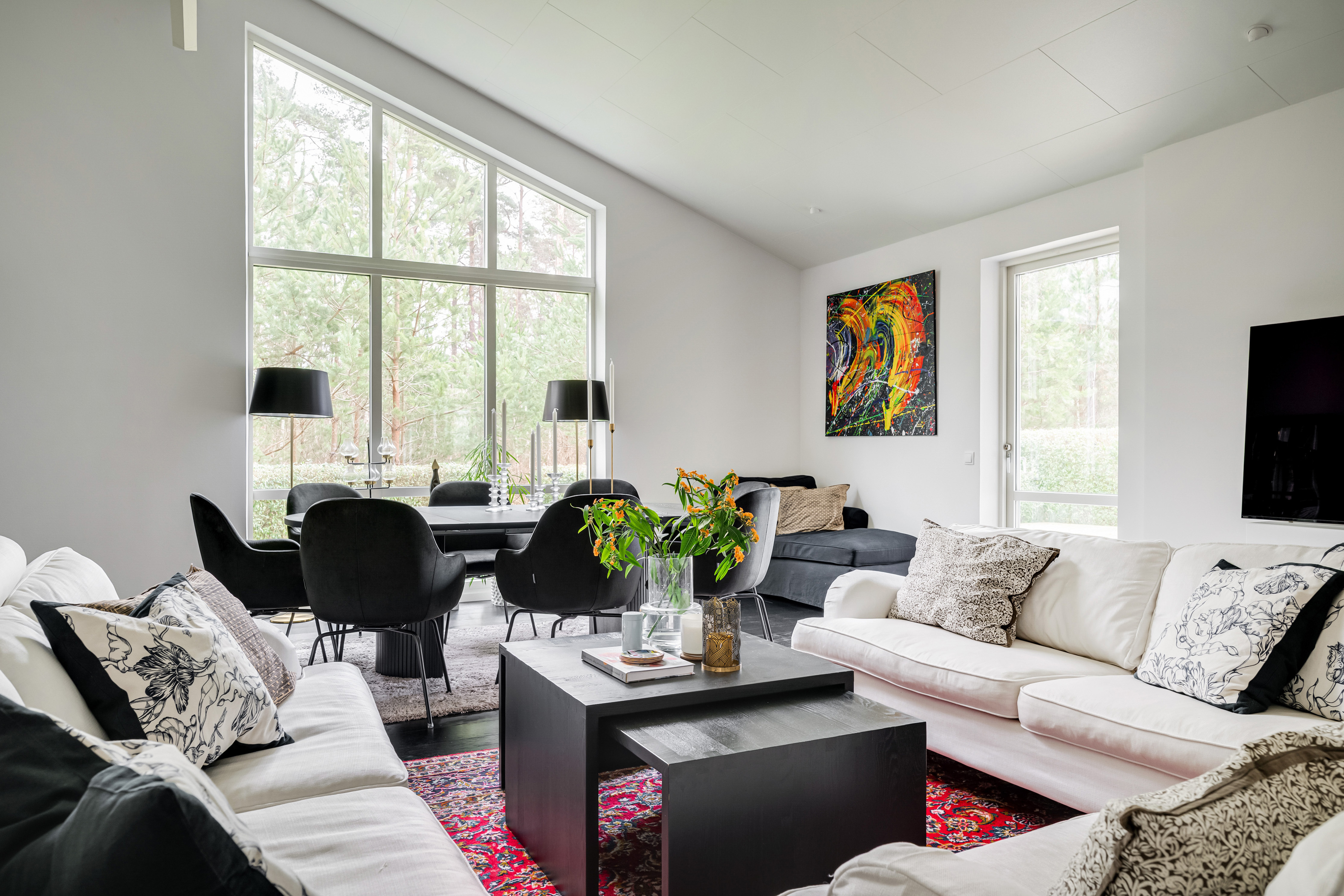 Vardagsrum/matrum med utsikt mot skogen