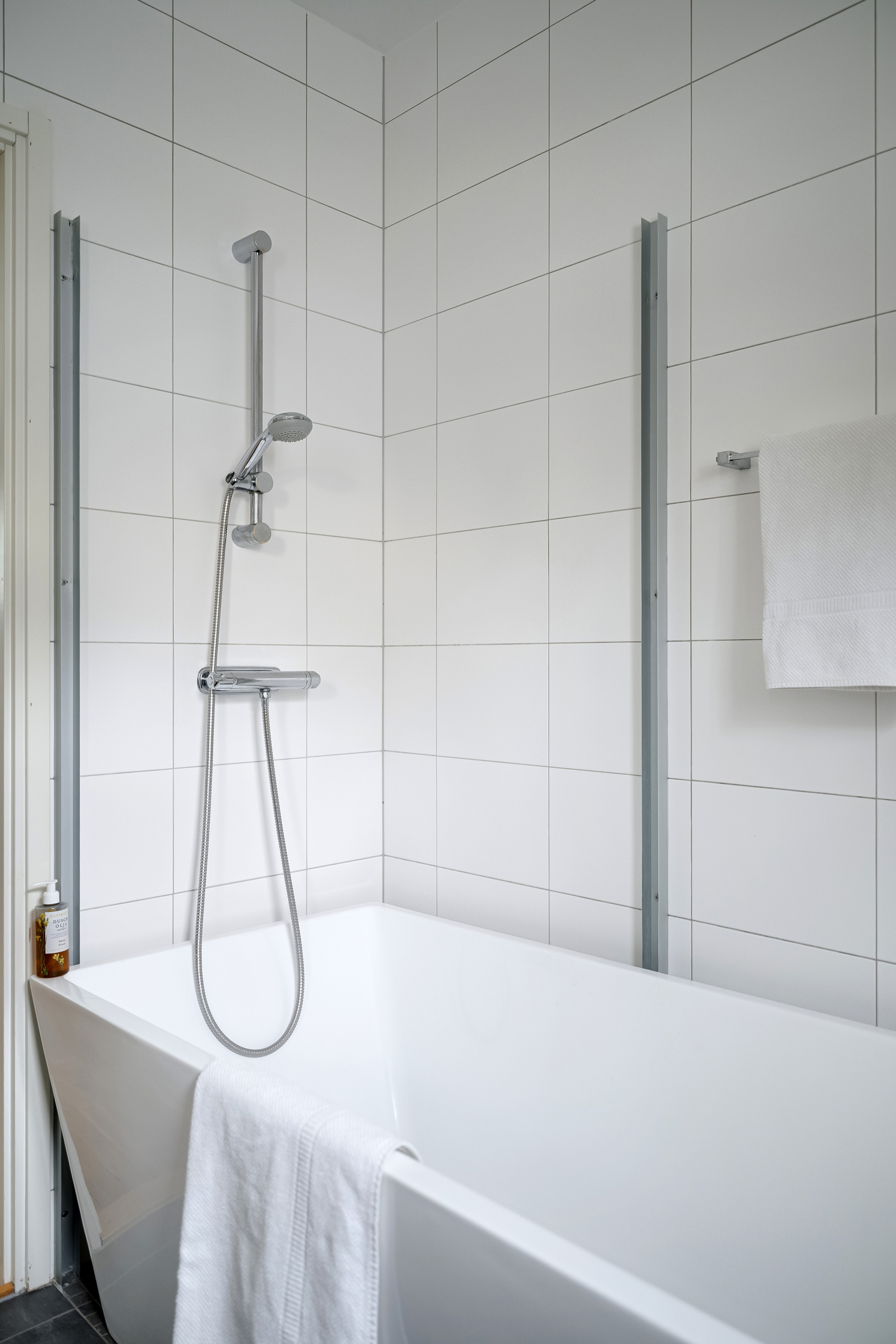 Stort badkar, men skenorna till duschhörn sitter kvar om man vill återskapa