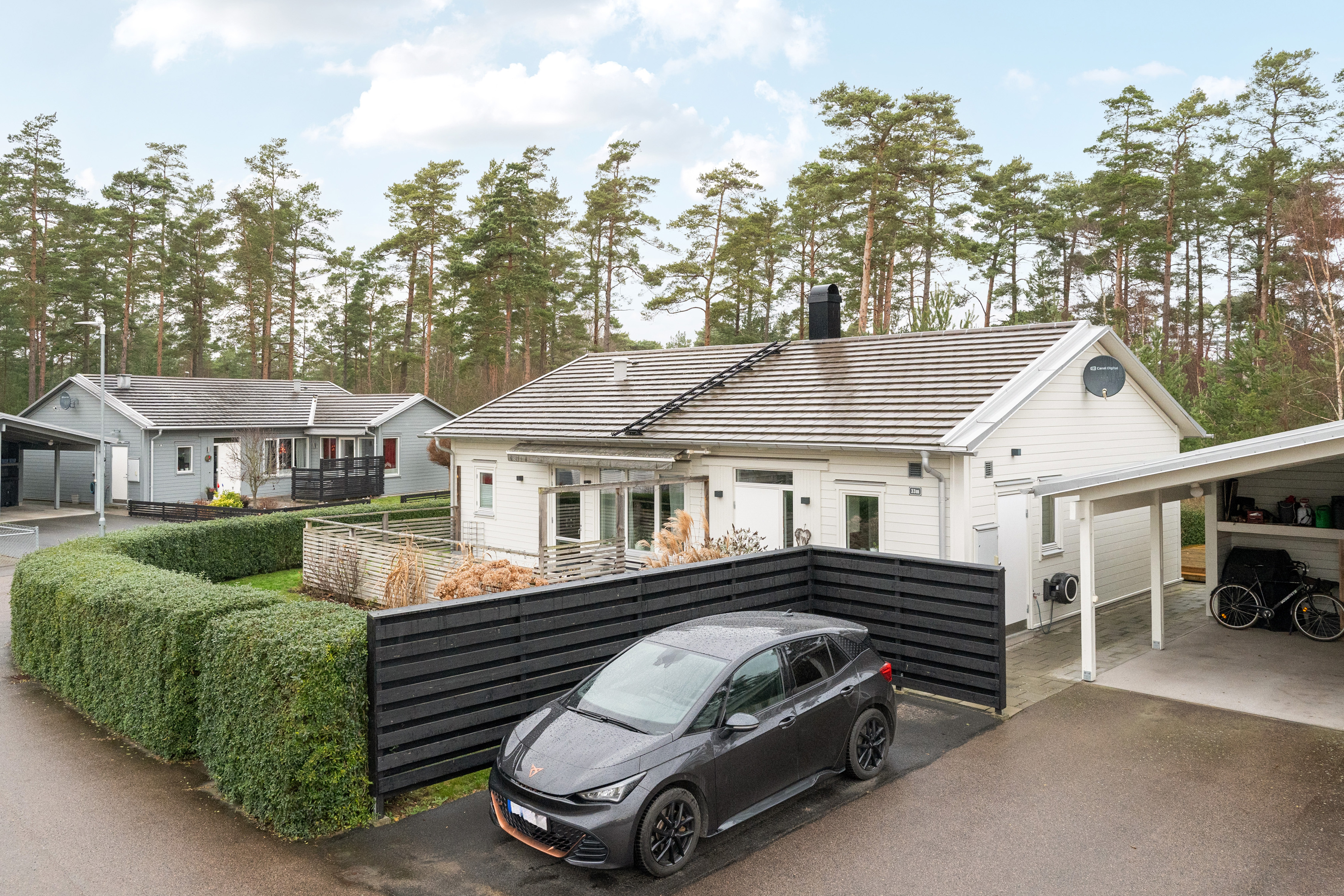 Framsida, carport/förråd och dubbla bilplatser