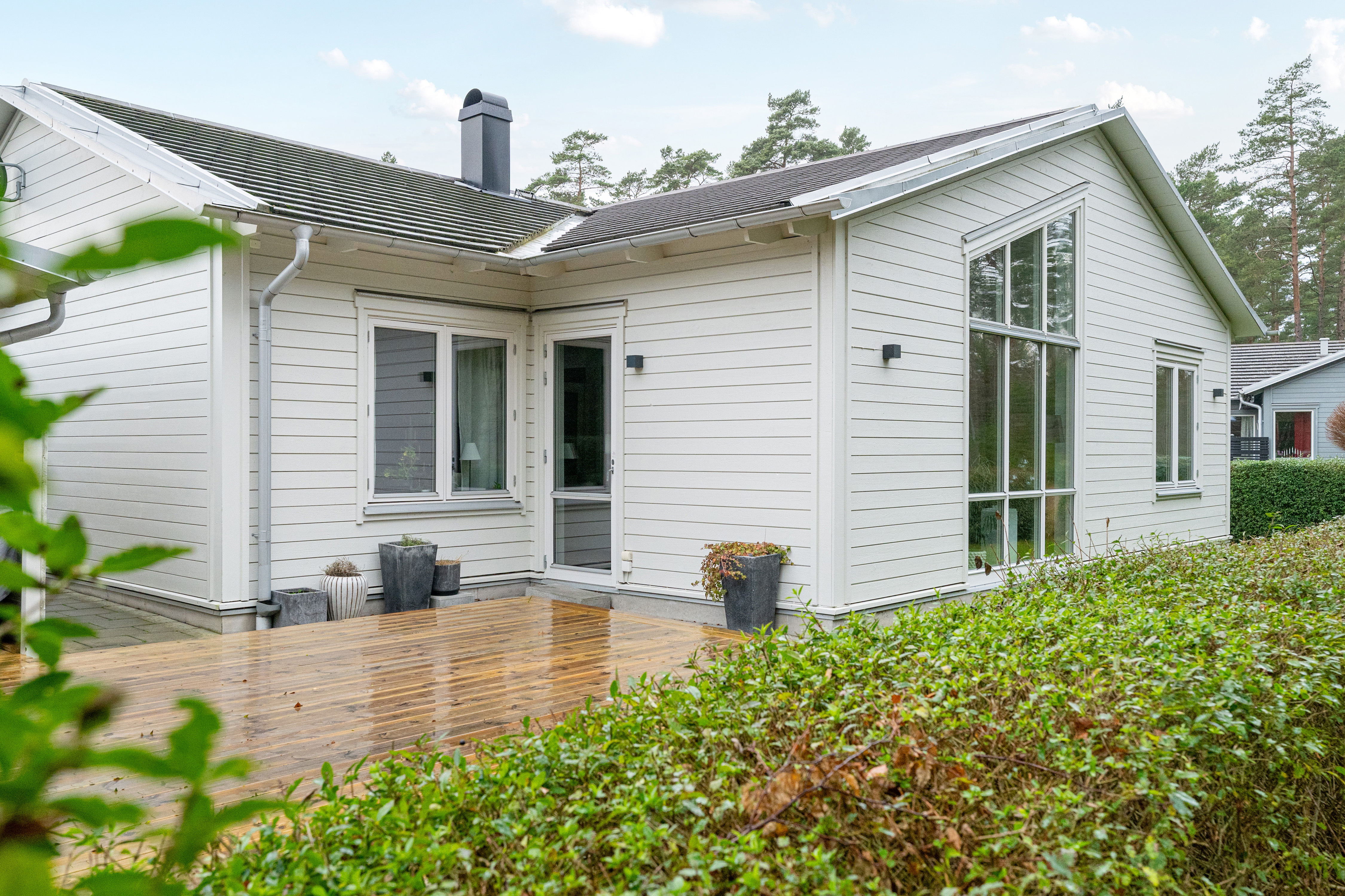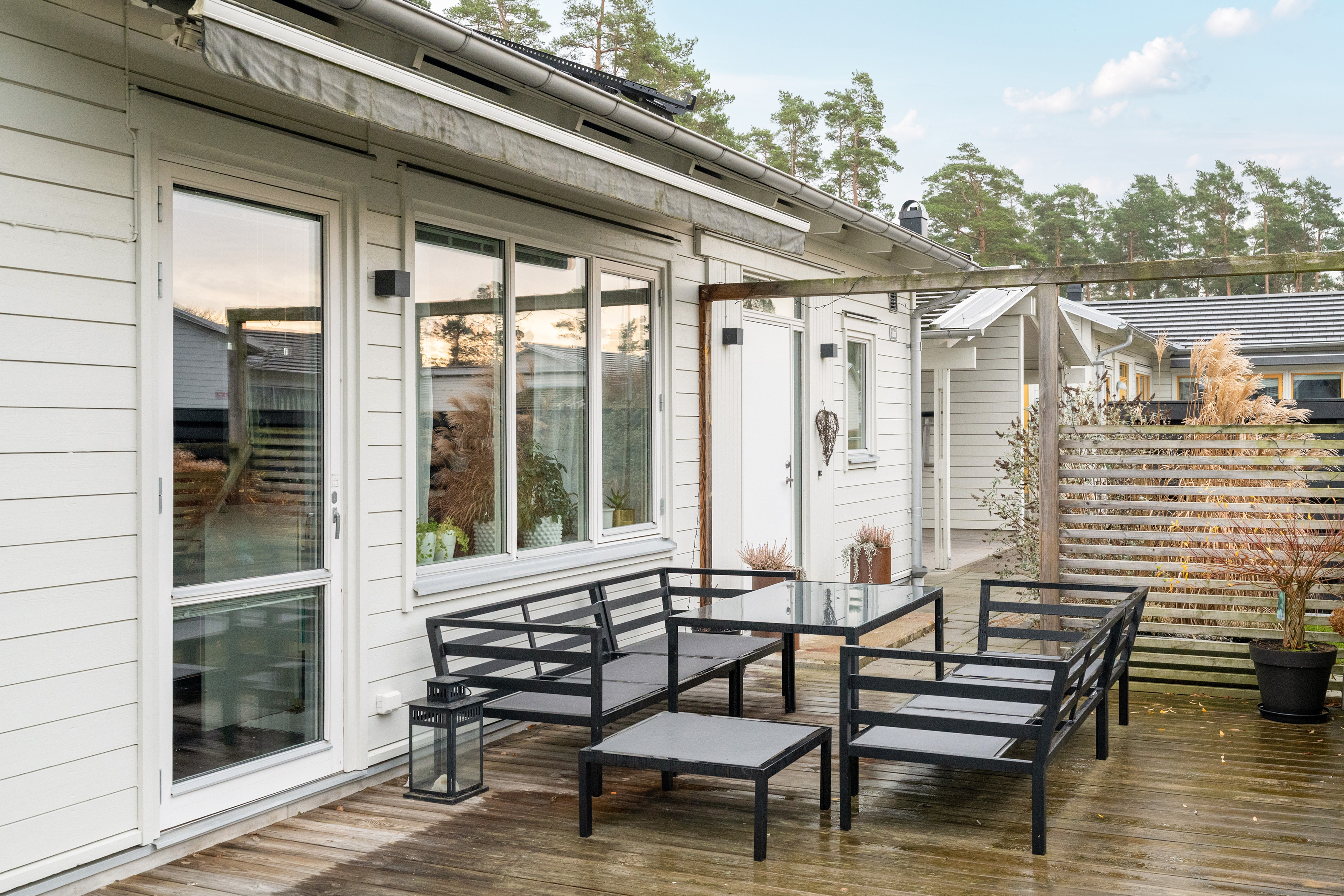 På husets framsida är det en stor altan utanför köket med markis över.